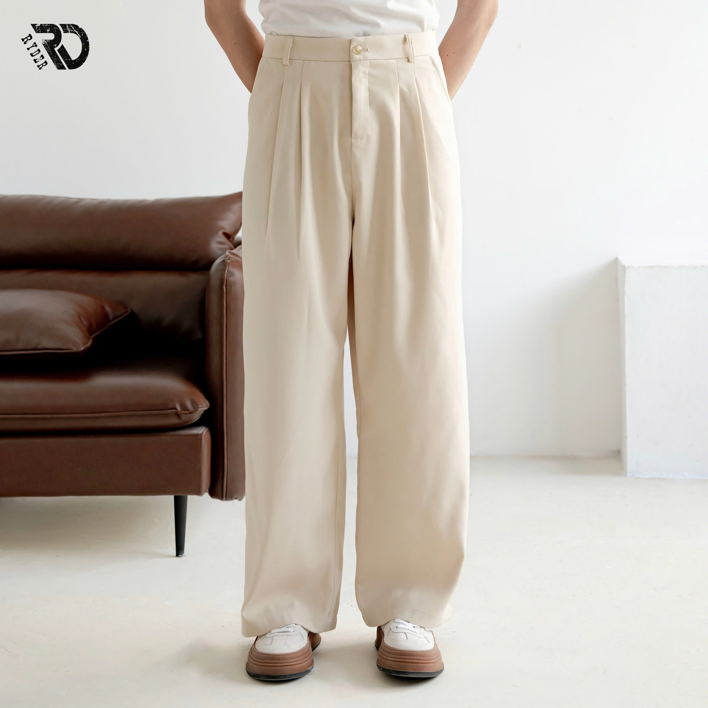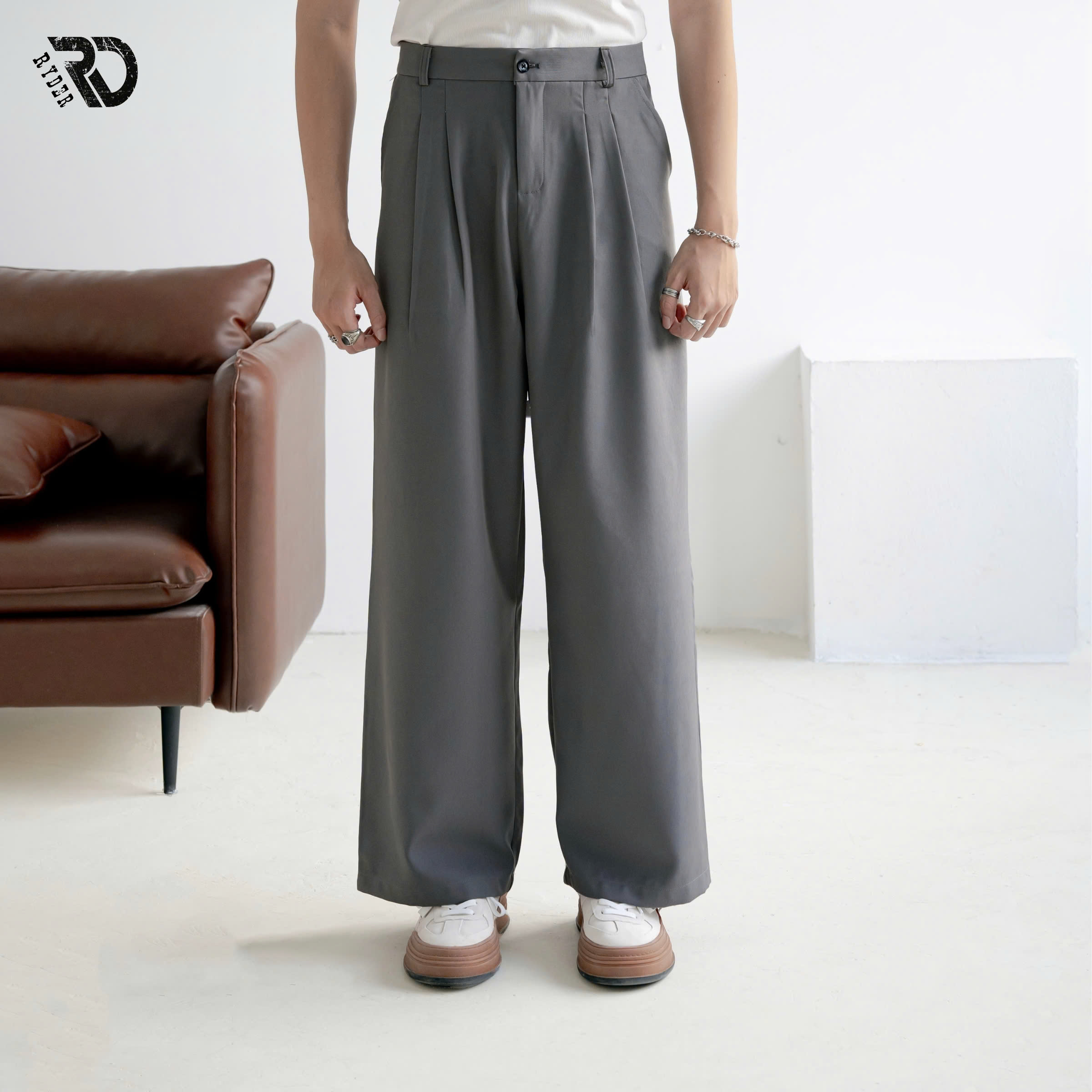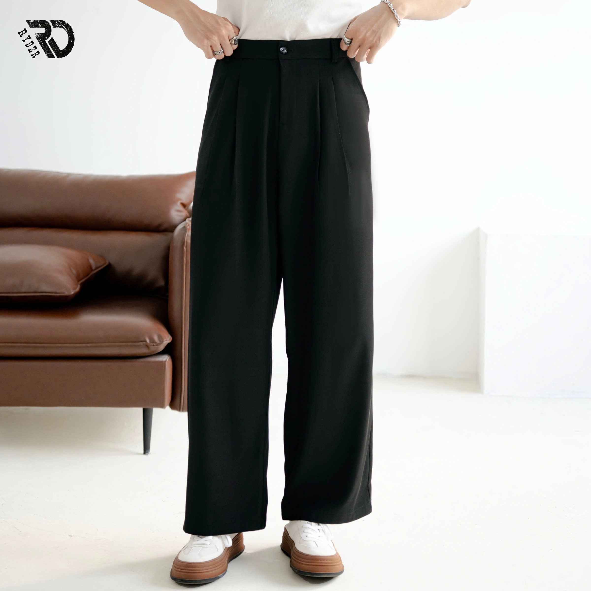 Form: Quần Wide-Leg (Quần ống rộng). Chất liệu: Vải Chevron (vải chéo Mỹ) thoáng khí, thấm hút tốt, ít nhăn